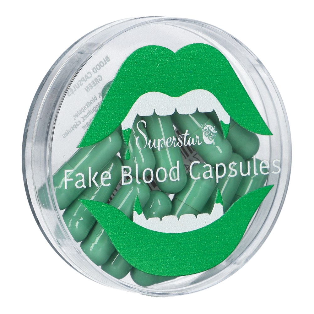 Las Cápsulas de Sangre Superstar Verde son perfectas para crear un efecto de sangre verde, transparente y ligeramente espumoso, al contacto con la saliva. Contienen un polvo naranja que se vuelve verde brillante al instante en la boca, ideal para monstruos aterradores, extraterrestres u otras criaturas de otro mundo.