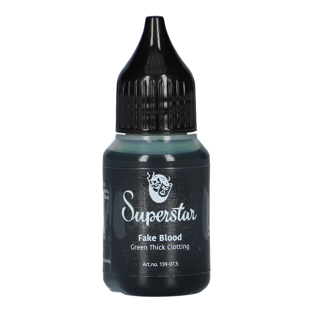 La Sangre Falsa Superstar – Verde Coagulante Espesa está disponible en varios tamaños: 20 ml (139-07.5) y 50 ml (139-07.6). La sangre falsa se presenta en una botella de plástico con un práctico tapón dosificador.
