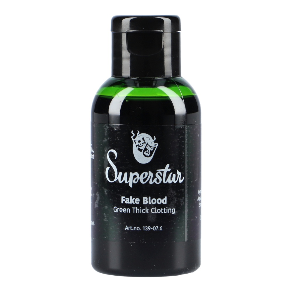 La Sangre Falsa Superstar – Verde Coagulante Espesa está disponible en varios tamaños: 20 ml (139-07.5) y 50 ml (139-07.6). La sangre falsa se presenta en una botella de plástico con un práctico tapón dosificador.