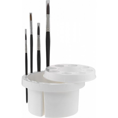 Limpiador de pinceles con un diámetro de 16,5 cm. Con tapa que también se puede utilizar como paleta de mezclas. Se pueden colocar 18 pinceles en el anillo exterior y también contiene dos cámaras de lavado separadas